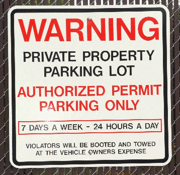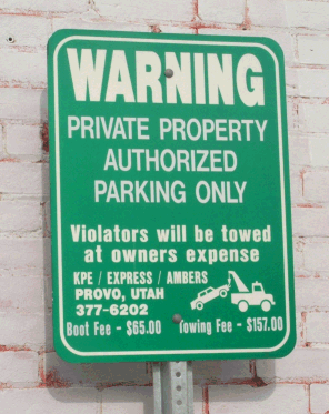 Ah, yes. Either $65.00 to get the boot removed, or $157.00 for the tow. This spurred the mayor to seek passage of a new ordinance, setting maximum fees for towing companies within city limits. These price caps, I'm told, were to be $15.00 for the boot and $25.00 for the tow. There's a very interesting question here, to which I don't know the answer: Who was it who got booted and/or towed? In other words, who has such clout with Mayor Thompson that he would not only propose the ordinance, but try to call an emergency meeting to get it passed? If he were engaged to be married, and if the wedding were imminent, and if the future mother-in-law already didn't like him, and if she were the bootee or the towee, this level of urgency might make sense -- but these conditions do not seem to apply. We may never know who elicits such a response, but that's okay. There are other fish to fry here at the blog. Before we throw them on the skillet, however, you need some more background. More Background For most American Forkers, the most recognizable description of the lot's location will be this: Its entrance and much of the lot itself are between the old Yogurt Parlor and the old Six Star discount store. For the rest of you, that's between Merchant Street and 100 West, on the north side of Main Street. There is an exit from the lot just south of the post office on Merchant Street. The lot is the private property of a prominent American Forker, Bill Jacob. (Did I mention that its private property?) The City's contribution is a small sign at the entrance, posted too high for some drivers to see, that says, "Private Parking. Permit Required." There are dozens of parking spaces in the lot, each reserved for someone, either current customers of a particular business, or employees, or perhaps others who have purchased the requisite permit. There is one sign for every parking space, and then some. Even if you miss the little City sign at the entrance, you could hardly miss, or even misinterpret, the other signs. There are many of these: