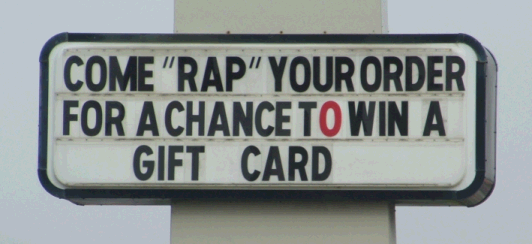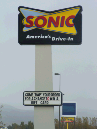The candidate makes a good pot of chili, every time. If you want to RSVP on Facebook, do it here. Rapping in American Fork The story the Associated Press picked up yesterday -- from KSL, I believe -- about some youths being cited for disorderly conduct for rapping their drive-through order at the American Fork McDonald's, was premature and rather light on the facts. The Salt Lake Tribune story was a little better. But bear in mind, before you leap to conclusions, that we still don't know the whole story. I love the free market. It's more responsive than government or a heavily-regulated (or intimidated) market, and it's unabashedly playful at times. A sign at the American Fork Sonic prompts this panegyric. I saw this today on State Road, near the former-KMart-former-Sears-Grand-current-empty-shell:
